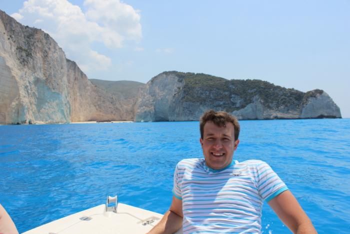 На обратном пути в тихом местечке Микро Ниси увидели вывеску на английском «Лодка в аренду в частные руки» и тут возникла идея прокатиться до знаменитых Голубых пещер и бухты Навайо.