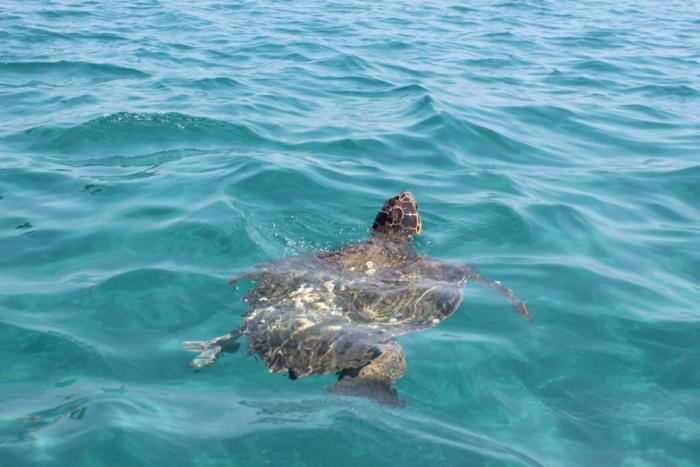 20.07.13 поехали на пляж Лаганас, где взяли 3-х часовую экскурсию на пещеры Кери и остров черепах (Маратониси). На Закинтосе есть национальный морской парк, который занимается защитой и сохранением мест откладывания яиц морских черепах caretta-caretta. Около причала нас ждала небольшая лодочка со стеклянным полом, водитель которой сразу же нас удивил – отъехав от причала он вылез в окно, а ногой управлял лодкой. Потом мы поняли в чем дело – он искал черепах. И вот она… Если бы не водитель, который начал кричать «See, caretta-caretta», мы бы подумали, что это камень в воде.Тут же подплыла другая лодка покрупнее, и они начали загонять черепашку между собой. Крик водителя: «Are you ready?», и вдруг черепаха показывает мордочку, заглатывает воздуха и снова уходит на дно.