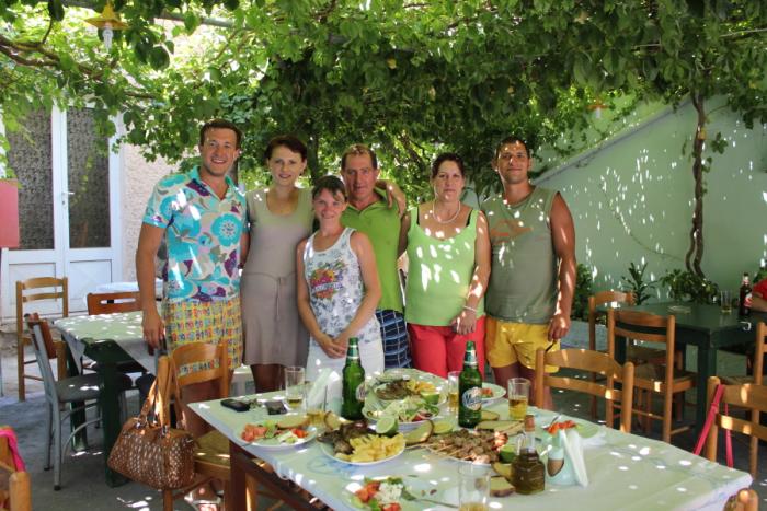 27.07.13 Наталья сообщила, что Денис приглашает нас отведать курицу, которую он забил и запек в печи. Мы не могли отказаться! Греки готовят очень вкусно! Курица Дениса не идет ни в какое сравнение с нашими курицами: другой цвет мяса, другой вкус, больший размер. В общем, пальчики оближешь! Денис с Натальей устроили нам прощальный обед.