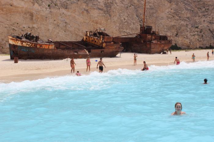 Осмотрев знаменитый затонувший в 1982 году корабль Панайотис, лежащий на берегу, поплавав в солях, мы решили возвращаться обратно в сторону Голубых пещер. Но тут нас ждали приключения: море взволновалось, поднялись достаточно большие волны с гребешками(для нашего небольшого катера они были крупноваты) и сильный ветер. В общем, о пещерах мы сразу забыли, так как приближаться к скалам было опасно, и поехали сдаваться. Конечно, было очень обидно, что не смогли посмотреть знаменитые Голубые пещеры. Может как-нибудь в следующий раз… Одно хотим сказать точно — прогулка на катере оставила много впечатлений! Одно дело, когда тебя катают, а другое — когда ты сам капитан, штурман и турист!
