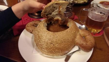 А чешский супчик наполнение может быть разное и гуляш, и брамборачка (картофельный суп), и цибулачка(луковый), даже чесночный в хлебе попадался. По мне так самый вкусный это наполнение, как говорят чехи гулашова (гуляш). Вкуснотень невероятная :)