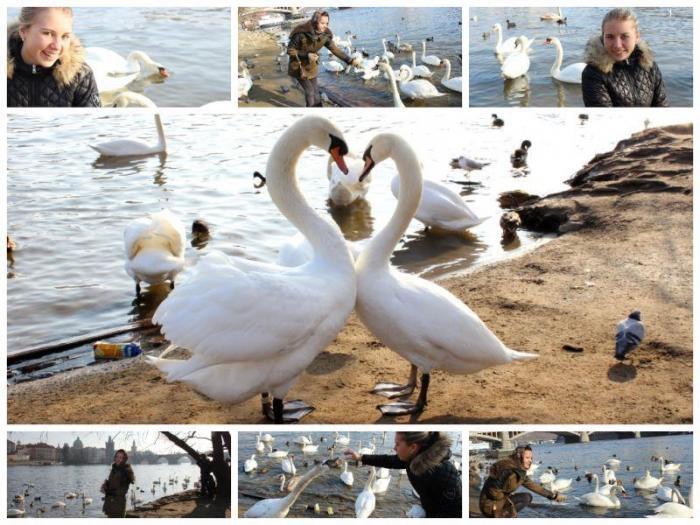 Потом вышли на набережную, где нас встретили дружелюбные красавцы: лебеди и голуби. Они окружили нас со всех сторон, в надежде, что у нас есть для них что-нибудь съедобное.
