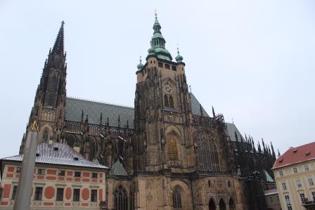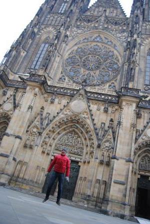 Изюминкой является Собор Святого Вита. Он причисляется к жемчужинам европейской готики, является художественной и национально-исторической святыней Чехии. Он настолько огромный, что не влезает в объектив фотоаппарата, при выходе из арки. Вот какие попытки мы предпринимали…