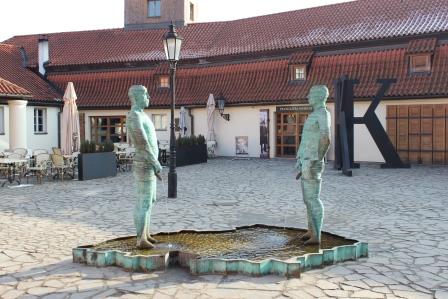 В поисках улочки мы вышли к музею Франца Кафки. На входе нас встретил фонтан Давида Черного, изображающий двух мужчин, выписывающих карту Чехии.