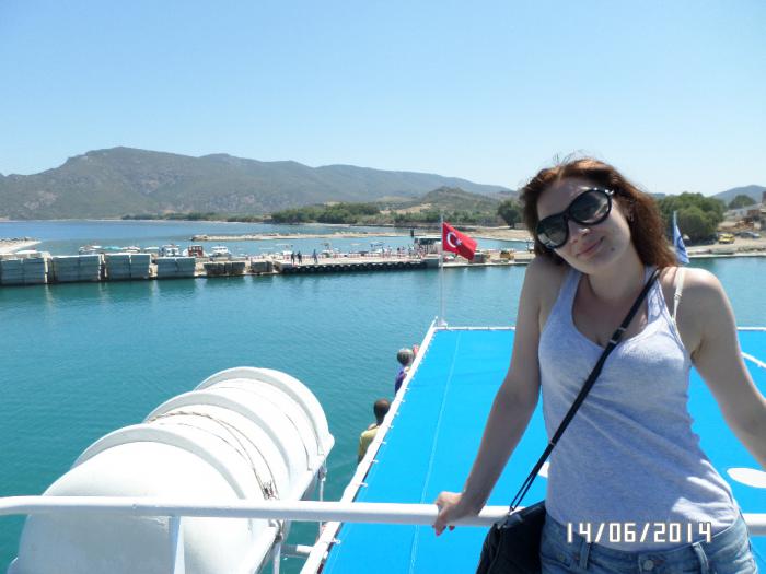 Отправление в 09.30 и мы воспользовались оставшимся временем, чтобы позавтракать в кафешке напротив. Паром небольшой, вмещает около 25 авто. Отчаливаем от набережной Бодрума