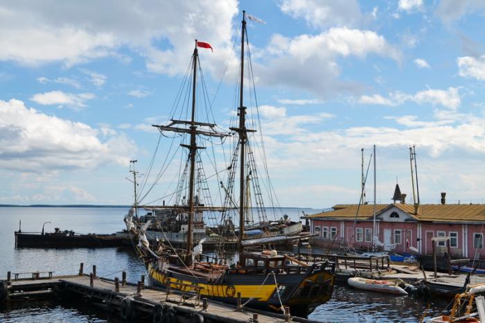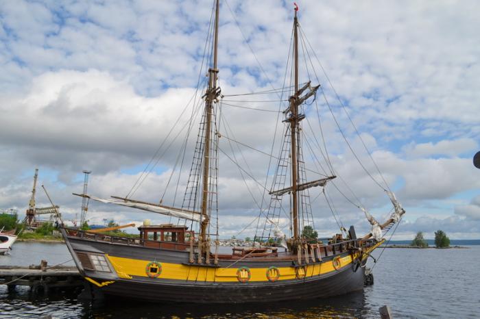 В настоящее время основные суда клуба – поморская ладья и бригантина. В момент нашего посещения ладья была в плавании, а бригантина – вот она, стоит пришвартованная в паре десятков метров от музея. И каков же был наш восторг, когда после интереснейшей экскурсии по музею экскурсовод передала нас капитану бригантины. Мы перебрались на судно, облазили его с носа до кормы, спустились в трюм, посмотрели, как живут моряки в походе, узнали, что помимо рулевого колеса в рубке у парусника еще имеется горизонтальный руль на корме и сами попробовали им порулить, в общем, смогли полностью удовлетворить свое любопытство.