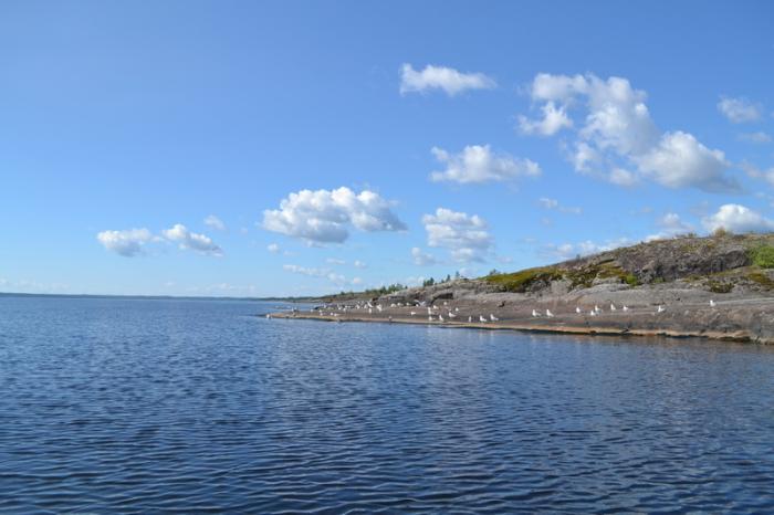 За все это время нам повстречалась лишь пара катеров – кругом пустота и умиротворение. Душа поет. Приближение к открытой воде мы почувствовали в буквальном смысле – она резко дыхнула нам в лицо сильным свежим ветром. И через несколько минут — вот оно во всей своей красе самое крупное в Европе Ладожское озеро! А у самого выхода из залива – лежбище чаек. Лепота!!!