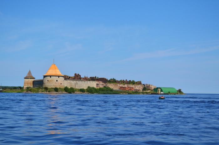 Асфальт сменился грунтовкой, но до «большой земли» было уже недалеко, и вскоре мы выехали на КАД. Заезд в Петербург мы не планировали, но хотелось по дороге домой посетить крепость «Орешек» в Шлиссельбурге. Как водится, немного поплутав по незнакомому городу, мы нашли памятник Петру I, от которого отходят катера к расположенной на острове крепости. А вот снова и Ладожское озеро – давно не виделись!