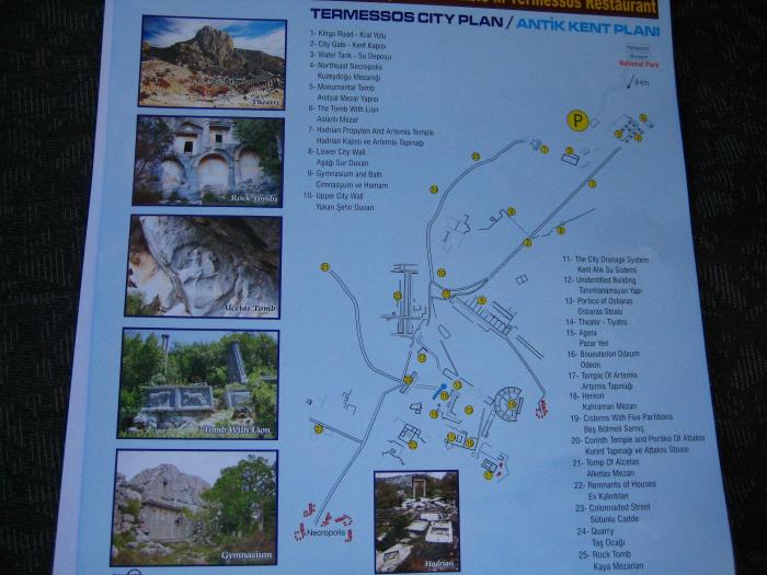 Въезд в «Национальный парк Гюллюк — Термессос» стоит уже привычные 5 лир с человека. К билетам полагаются схема города и влажные салфетки с видами Термессоса на упаковке.