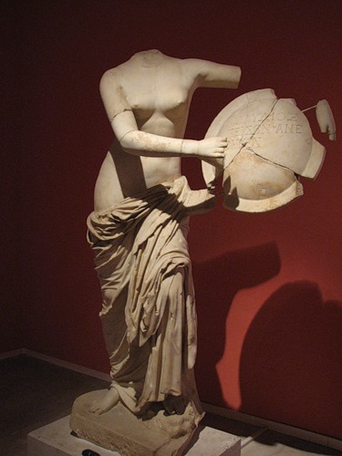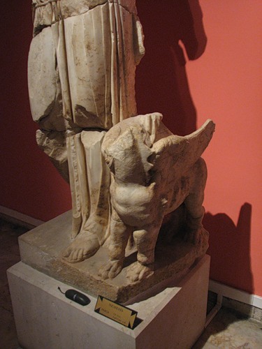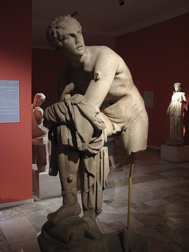 Неподалеку археологи извлекли статую бога торговли и хитрости Гермеса (Меркурия), покровителя послов, путников и магов. Он служил вестником богов, ибо славился высокой скоростью передвижения благодаря крылатым сандалиям. Именно эти сандалии и поправляет Гермес из Южных бань Перге, правда, крылышки то от них кто-то отбил. А под ногой у бога-скорохода один из его символов – черепаха. Вроде бы неожиданное сочетание, однако, на самом деле, оно никак не связано с расстояниями и скоростями: младенец Гермес, увидев черепаху, содрал с нее панцирь, добавил 7 струн, изобретя таким образом лиру, после чего продал ее Аполлону (вот откуда у солнцеликого бога символ-лира!):
