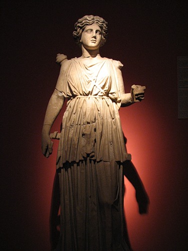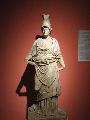 Скульптура Афины. Как и положено богине-воительнице, на ней шлем и нагрудный панцирь из рыбьих чешуек с головой Медузы-Горгоны в центре