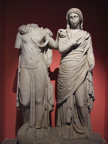Две женские фигуры (В правой опознали меценатку Планчию Магну (о которой мы говорили чуть раньше), а вот вторая, безголовая, принадлежит по предположениям археологов некоей «богине 2-го уровня» из свиты Диониса – не зря ж она держит в своей руке, положенной на плечо Планчии Магны, символическую гроздь винограда):
