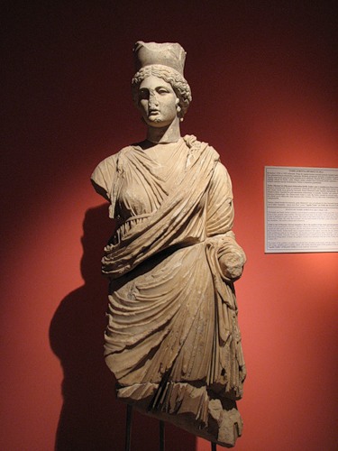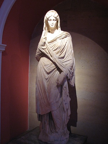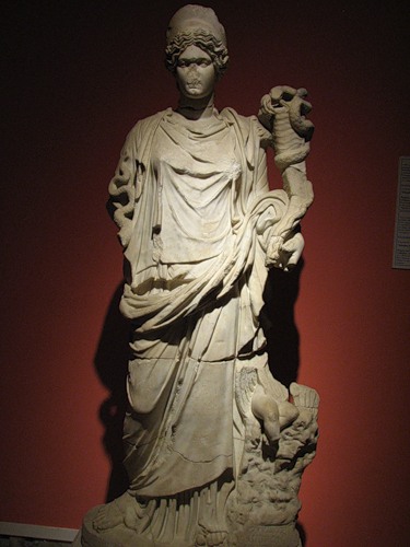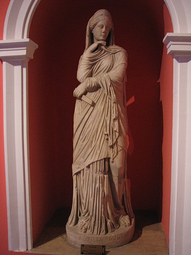 Внутренние помещения также украшали колоннами и статуями. Мы видим Немезиду, богиню возмездия. О ее «профессиональной ориентации» свидетельствуют несколько атрибутов: обломанная линейка в левой руке (символ контроля за соблюдением законов божеских и человеческих), такое же полусломанное колесо под лапой спутника-грифона (намек на быстроту возмездия) и согнутая в локте правая рука, символизирующая неизбежность кары (в те времена локоть являлся мерой длины, так что жест говорил — сколько веревочке не виться, но всему можно измерить предел):