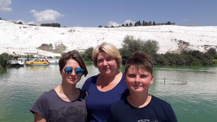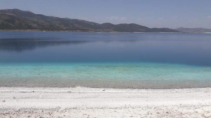 Выезжая из отеля мысленно помахали ручкой двум машинам на российских номерах из МО и покатили на запад. Из Аланьи мы выехали в 7:30 и направились в сторону Антальи – дорога очень хорошая, несмотря на множество серпантинов. Через полтора часа уже ехали по Анталье. Сразу же вспомнили свой родной Ростов с его пробками в утренние часы. Анталья, оказывается достаточно крупный город с населением 1,5 млн человек. Проехав Анталью и перекусив симитами по дороге, поехали в сторону города Денизли по дороге Е-87 и сделали небольшой крюк, чтобы заехать на озеро Салда. Это озеро как интересную достопримечательность нам посоветовали наши новые знакомые из Малатьи. Мы ничуть не пожалели, что проехали лишние 30-50 км. Только представьте себе озеро со светло-голубой водой и белым мраморным песком. Это озеро еще называют «турецкими Мальдивами». Оно небольшое – где-то 6 км в диаметре, но там есть пляж, куда люди приезжают издалека не только, чтобы искупаться, но и испытать лечебные свойства грязи со дна этого озера.