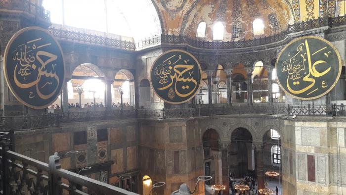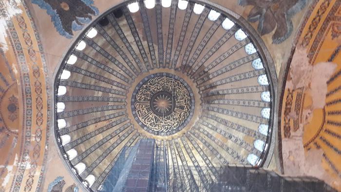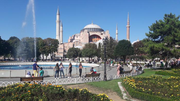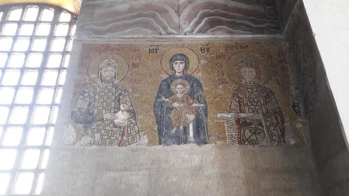 Айя София – на сегодняшний день это третья постройка с таким же названием и на том же месте. Первая церковь была построена при императоре Константине в 360 году. Это была базилика с деревянной крышей, но во время мятежа при императоре Аркадии в 404 году она сгорела. В 415 году при императоре Феодосии II церковь было выстроена заново и посвящена заново, при этом сохранился стиль базилики. До 532 года это была крупнейшее церковное здание в Константинополе. После восстания Ника против Юстиниана церковь была разрушена, чтобы построить новую более великую церковь. Император Юстиниан построил новый храм с названием «Святая Мудрость» как самый большой в мире собор. Строительство было начато в 532 году и завершилось через пять лет в 537 году. Посвящение произошло 27 декабря 537 года с пышной церемонией. Церковь была спланирована двумя архитекторами Исидором из Милета (район Балат в Истанбуле) и Антемиосом из Тралла (ныне город Айдын). Согласно их плану, главный купол поддерживался на двух полу-куполах в восточной и западной частях. С завоеванием Константинополя султаном Мехмедом Фатихом в 1453 году, Айя София как самое крупное религиозное сооружение в городе была превращена в мечеть. Во время Османского периода Айя София много раз реставрировалась. В 16 веке архитектором Синаном были пристроены поддерживающие стены и установлены минареты. Во времена султана Абдул-Меджида были приглашены швейцарские архитекторы чтобы также произвести ремонтные работы в 1847-49 годах. Айя-София отражающая комбинацию христианских и исламских элементов 1 февраля 1935 года была превращена в музей. Таким образом Айя-София в течение 916 лет была христианским храмом, 478 лет – мечетью и 84 года – музеем.