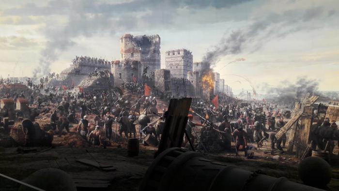 Посетили Панораму 1453 года. Куполообразное полотно, изображающее события, происходившие поблизости 29 мая 1453 года. Перед картиной находятся пушки, луки, стрелы, повозки. Это как бы продолжение картины, представляющее собой реальные вещи. Очень похоже на панораму обороны Севастополя 1854 года.