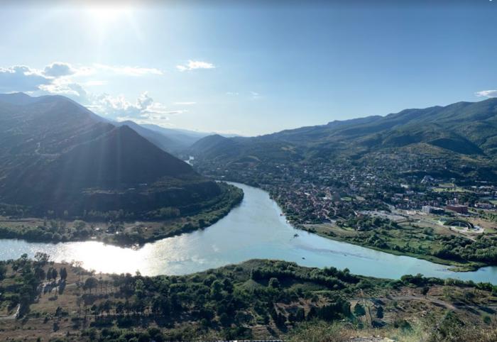 Из Ананури выезжаем в столицу древней Грузии г. Мцхета. Там направляемся к монастырю Джвари с которого открывается хороший вид на город и слияние двух рек Куры и Арагви. Вода у этих рек разного цвета и не смешивается в месте их слияния.