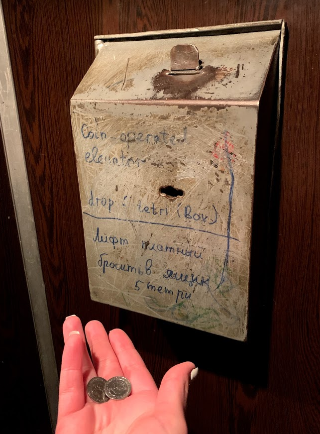 Чтобы лифт поехал, в специальный ящичек нужно бросить монетку 5 тетри.