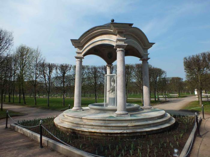 Небольшая жалость — тюльпаны ещё не зацвели. Под стеклом скульптура «Мальчик с гусем», а розовым фонтан назван из-за цвета мраморных колонн.