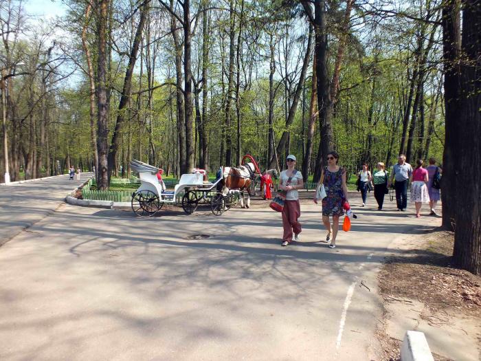 Вход в усадьбу с десяти утра, понедельник и вторник — выходные. Приехали в субботу без пятнадцати десять и припарковались около проходной вторыми. Надо сказать, что это самое удачное время: позже машинами заставят всю улицу — специальной парковки нет. К тому же, более поздние, шумные компании не досаждают и есть возможность погулять в одиночестве. Вход сто пятьдесят рублей, для иностранцев почему-то дороже. Не первый раз этому удивляюсь. Некрасиво как-то…