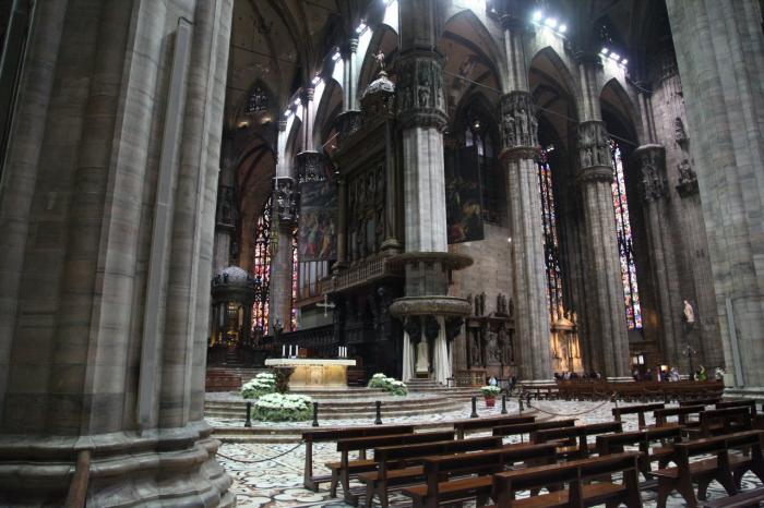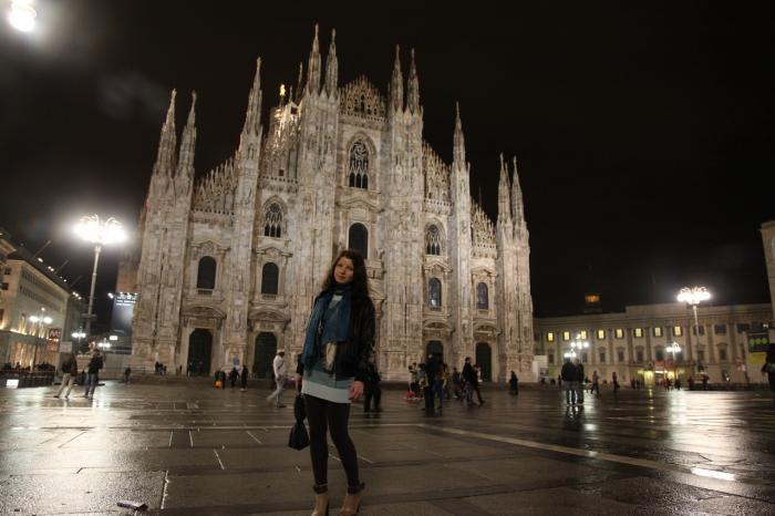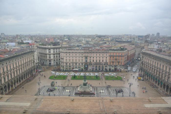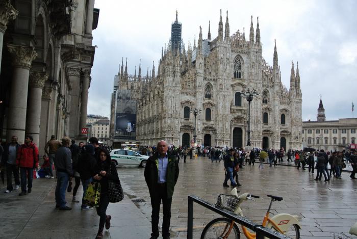 После завтрака, садимся в метро и едем в центр города. Милан встречает нас дождём. Надо сказать, что это был один из двух дождливых дней за всё наше путешествие. Что мы знаем про Милан? Это второй по величине город Италии, современный мегаполис, финансово-экономическая столица страны, один из центров мировой моды. Оказывается, в Милане был построен самый первый небоскрёб – башня Пирелли. Этот город основан в 600 г до н. э., имеет богатейшую историю и хранит множество исторических достопримечательностей. Мы вышли на станции метро «Дуомо» и оказались на главной площади города, центром которой и был величественный беломраморный Собор Дуомо. Это одна из самых больших готических церквей в мире, потрясающая не только красотой фасада, но и великолепием внутреннего убранства. Вход в собор бесплатный, небольшая очередь, которая движется довольно быстро.