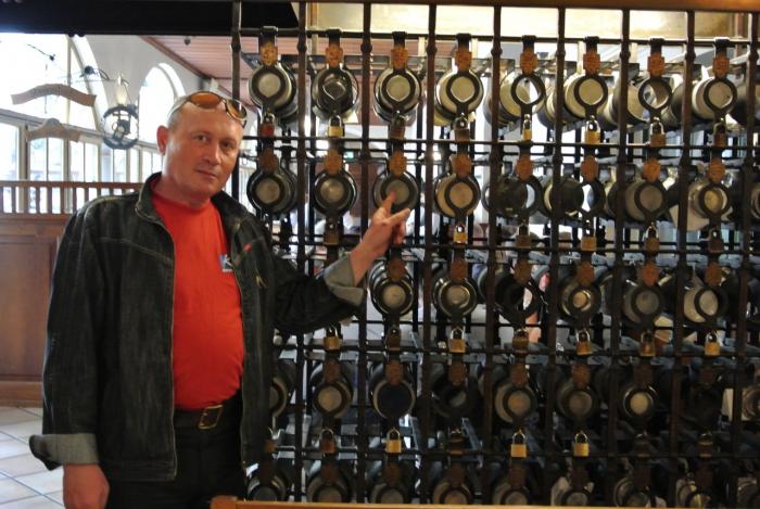В этом зале есть специальный стеллаж, где в индивидуальных ячейках, закрытых на маленькие висячие замочки, хранятся именные кружки завсегдатаев заведения. Очень трогательная картина, когда пожилому баварцу с колоритными усами, выдают ключик от замочка, в том, как он открывает ячейку, достаёт свою кружку и идёт к бармену за пивом.