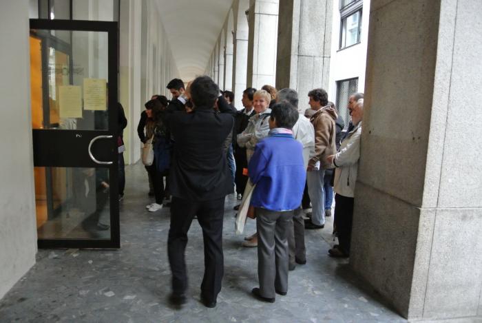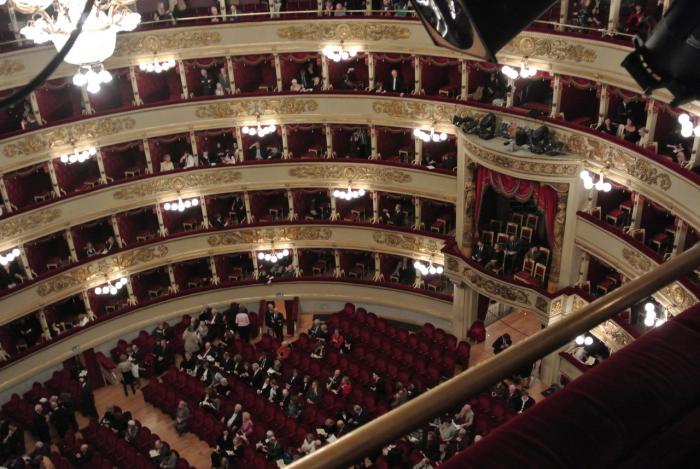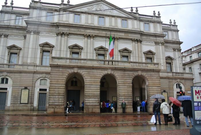 Мы устроились в одном ресторанчике, официант принёс обогреватель, куртки мы повесили на спинки стульев и очень вкусно и душевно пообедали. В дальнейших планах было посещение театра Ла Скала и нужно было купить билеты. Один из проходов галереи ведёт на площадь Ла Скала, где установлен памятник Леонардо да Винчи, и находится сам театр. На сегодняшний вечер в репертуаре стояла опера Джузеппе Верди «OBERTO Conte di San Bonifatio» Название нам ни о чём не говорило, но посмотреть один из известнейших оперных театров хотелось. Билеты в кассе театра в день представления продают только за 2 часа до его начала, что ж – идём искать кассу. Касса нашлась в вестибюле станции метро «Дуомо», но цены «кусались» очень сильно – около 300 евро за билет. Решили, что попробуем купить билеты по дешевле перед началом спектакля. Ещё побродили по площади и окресностям, снова промокли и поехали в отель. Немного отдохнув, переодевшись, мы с Андреем едем за билетами и, если повезёт – в театр. Около театральной кассы стояла толпа страждущих приобщиться к оперному искусству и женщина, которая раздавала талоны с номерами для приобретения билетов.