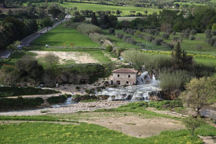 Доехали до Manciano, повернули на Сатурнию и там началась фактически курортная зона. Но купание в самих источниках бесплатно. Легенда гласит, что Термы Сатурнии возникли в том месте, где Юпитер в гневе метнул молнию в Сатурна, но промахнулся. А в там, куда попало копьё, забил целебный источник. Рядом с источником находится старая мельница, что придаёт ещё больший колорит этому месту. Вода бьёт из-под земли и стекает в «ванны» естественного происхождения в, которых, собственно, народ и нежится.