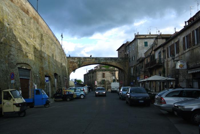 Пообедав и переждав очередной дождь в пиццерии, мы отправились в другую сторону от площади Феррари – к воротам Порта Сопрана. Это ворота Старого города, за которыми начиналась дорога в Рим, были составной частью крепостной стены, окружавшей город.