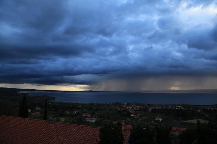 Остановились ненадолго, прошлись по улочкам, зашли в магазины, купили вина. Что интересно, каждый магазин торгует винами, произведёнными в определённых местах, и ассортимент практически не повторяется. А расположены они так, что как будто входишь внутрь горы. Очень интересное место. Дальше по пути огибаем озеро Больсена. Оно находится в котловине, на его берегу одноимённый город. Вдалеке идёт дождь, но мы от него «убежали».
