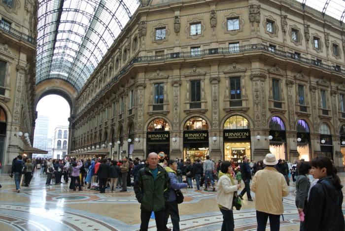 А дождь всё лил, и мы отправились галерею Виторио Эммануэле 11. Эта галерея, точнее её центр – фактически одна из самых больших крытых площадей мира, в ней расположены бутики, рестораны. Сверху она закрыта стеклянной крышей, в месте перекрёста проходов – большой стеклянный купол.