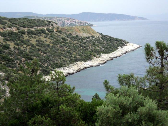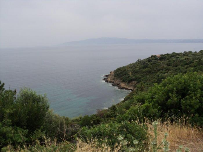 В следующий раз мы решили поехать в древний город Уранополис (греч. «город неба») – самый крайний город «пальца» Афон. Посмотрев по карте, нам показалось, что от нашего Ханиоти до Уранополиса не так уж и далеко. Навигатора в арендованном авто не было и мы двинулись в путь по карте. Заблудиться по дороге трудно, указателей вполне достаточно. Иногда дорога шла вдоль берега и петляла в соответствии с его изгибами. Качество покрытия хорошее, но из-за постоянных поворотов особо не разгонишься. Виды очень красивые!