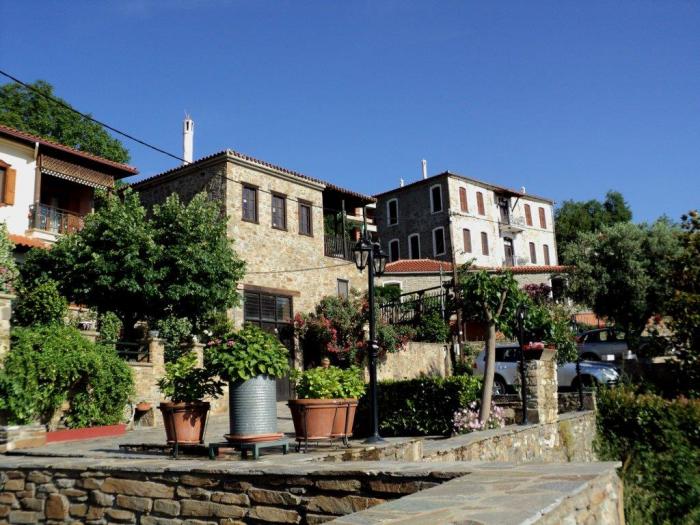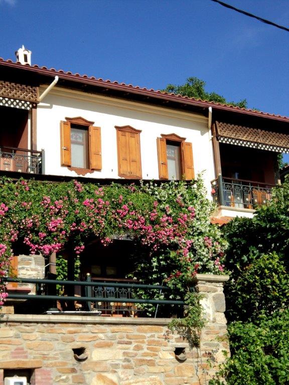 Выехав из Мармараса, мы решили поехать на пляж Вурвуру. Посмотрели по карте – есть короткая дорога через горы. Поехали. Поднялись в горы, и оказались в очень милой деревушке Парфенонас, а там асфальтированная дорога закончилась и началась грунтовая. Мимо нас проехала пара внедорожников, лихо покачиваясь и переезжая ямы… но мы были на фолькцвагене Поло… остановились у таверны спросить правильно ли мы вообще едем и проедем ли на такой машине… Официант отлично говорил по-русски и объяснил что накануне был дождь, дорога дальше плохая и мы не проедем. А деревушка в которой мы оказались была просто очаровательна! Милые миниатюрные домики, украшенные цветами. Мы оставили машину около таверны и пошли прогуляться по улочкам.
