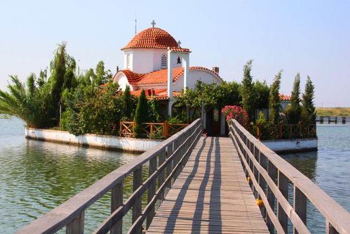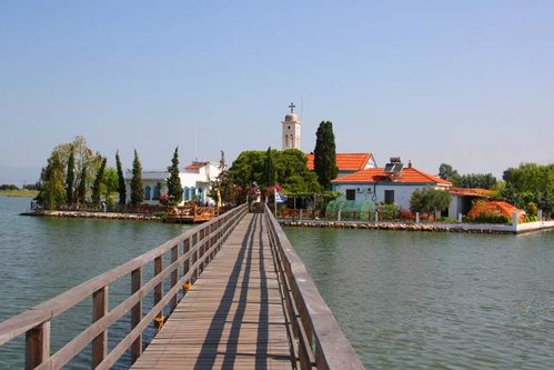 Дальше дорога ведет нас мимо озера Вестонида, это озеро от моря отделено перешейком всего в 20 метров, поэтому вода в нем соленая, но интересно оно не этим, а монастырем, который расположен на нескольких островках этого озера.