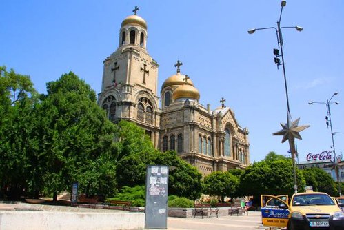 Мы въехали в Варну, и этот принцип четко соблюдался и здесь. Предложения по недвижимости на русском, остальное на болгарском. Варна заметно наряднее и богаче других болгарских городов, через которые мы уже сегодня проехали. Местами красива. Мы воспользовались проездом через этот город и свернули к Успенскому собору. Он расположен в центре, в небольшом тенистом сквере, рядом огромное скопление таксистов, вот к ним под бочок мы и затесались.