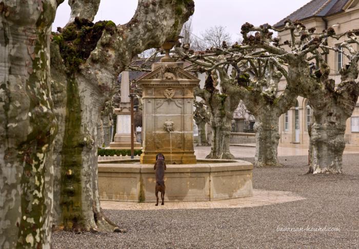Пропитавшись до кончика хвоста атмосферой Рождества, мы двинули на юг, к Провансу. По дороге остановка на ночевку в маааленькой деревне Sain-Germain-du-Bois. Ехали в этот раз не по автобану, а локальными дорогами. Набрели на одну из крайне приятных платановых площадей с фонтаном перед мэрией в Арле (Arlay) (наша баварская гончая, как обычно, полезла в фонтан — слабость у него к фонтанам)…