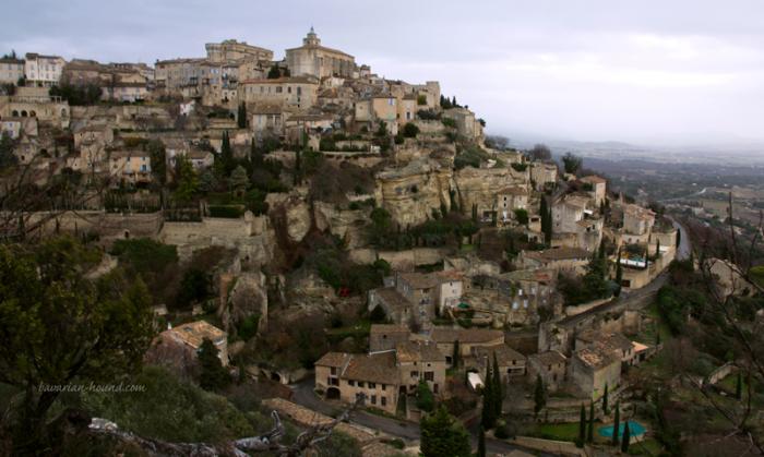 В Roussillon ушло еще часа полтора — наш любопытный пес заглядывал всем в окна и нюхал цветочки, разговаривал с местными собаками через забор и забирался на все парапеты, чтобы посмотреть, что там внизу (Руссильон стоит у охряного карьера и вид действительно замечательный). В общем, когда мы выехали из Руссильона, было очевидно, что в Карпентру на трюфеля мы не успели. Значит, через L'Isle-sur-la-Sorgue едем за вином в Chateauneuf-du-Pape. И через Горд. Или Fontaine De Vaucluse?..