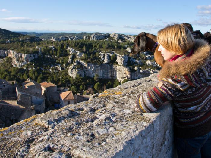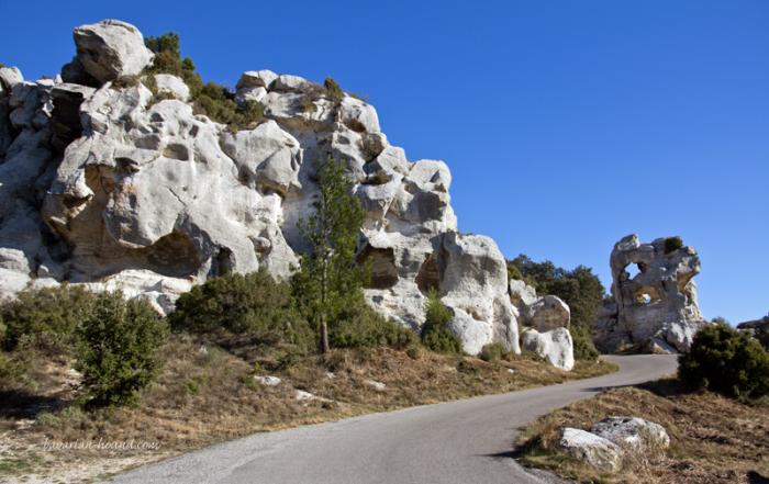 Выехали из Менерба мы только около часа дня (отстаем от графика часа на четыре). До следующей точки маршрута Les Baux-de-Provence около 40 км. По дороге пейзажи меняются — появляются белые известняковые скалы и сосны. Изумительное место для пеших и велосипедных прогулок, медитаций, пикников с друзьями… Но сегодня не удастся реализовать эти идеи — у нашего пса серьезно повреждена лапа (еще дома), а функция ходьбы outdoors у него не заложена, он может только носиться и прыгать. Остановились буквально на полчаса и, увы, проезжаем мимо.