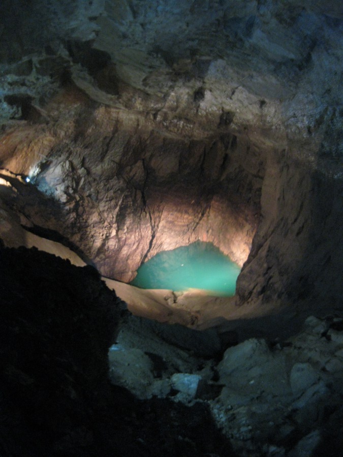 Собравшись, прихватив теплую одежду (напомню, в пещере 14ºС), поехали. Вход в пещеру стоит, если моя память не спит с другим, 300 р. (традиционно, с экскурсией в два раза дороже). Лично меня, как человека бывавшего в Крымских пещерах, эта потряссла масштабами. Это подземный дворец, куда тебя везет отдельное метро! Фотографий в интернете также достаточно, скажу только что посетить это место стоит обязательно, и ограничусь несколькими фотографиями. Подземное озеро: