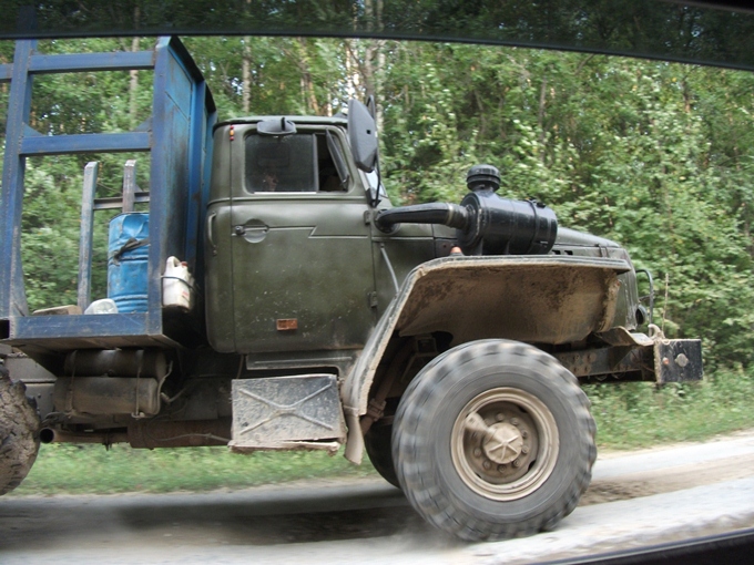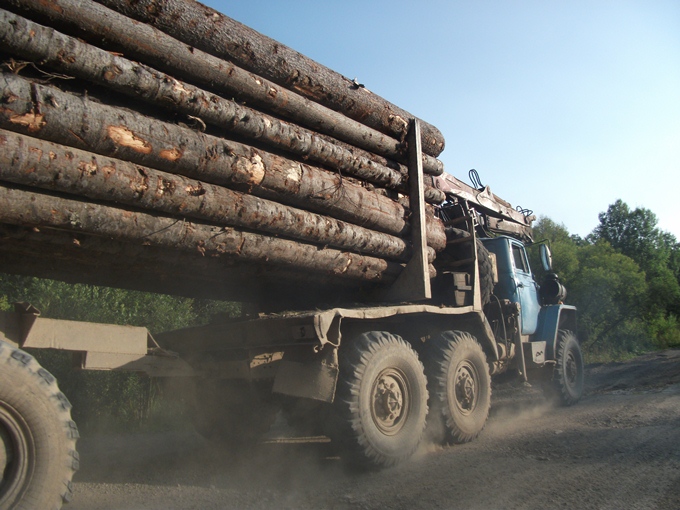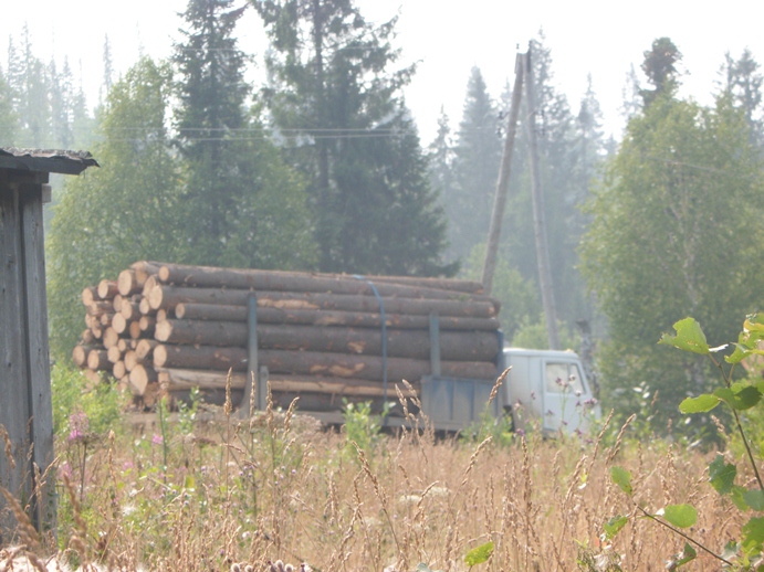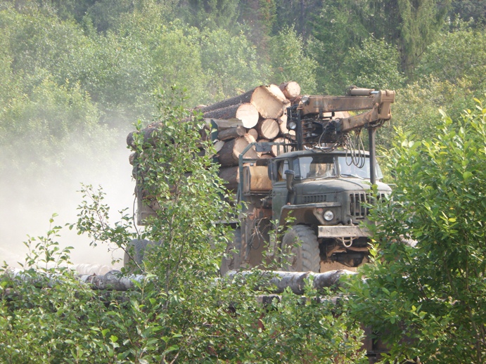 В это время по дороге проехал лесовоз. Кстати они короткие, раньше, когда мы жили на Чикмане они были очень длинные, в длинну самого дерева