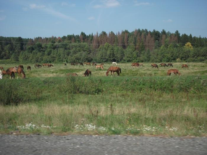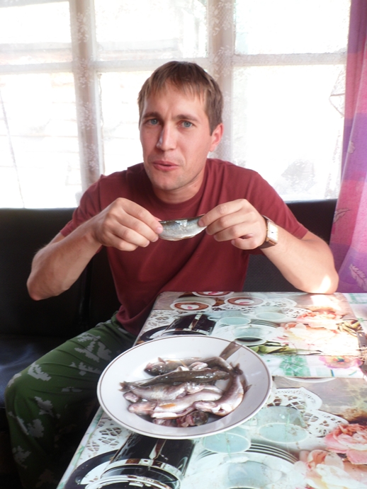 В дорогу нам дали помидоров и огурцов, накормили соленым хариузом… ммм, а вкус то знакомый. Съел 2 рыбки. Раньше папа ловил они были большими, а щас реки обмелели, крупную рыбу птицы ловят, осталась только маленькая. А реки мелеют, потому что болота высыхают, а болота высыхают, потому что лес вырубается-элементарная цепная рекация