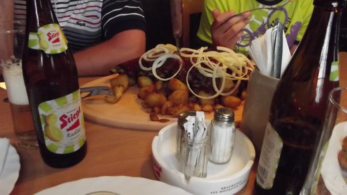 Ужинать мы пошли в известный ресторан «Сантиметр», хоть и для этого пришлось вооружиться картой и пройти пару кварталов. Уж больно хотелось попробовать двухметровую колбасу, метровое пиво и т.д. Интересно было заказать еду по цене не за блюдо, а за сантиметры. Но, к сожалению, из метрового ассортимента там осталась только колбаса и крепкая выпивка. Меню тоже, кстати, метровое – узкая такая лента, длиной в метр. Но поскольку выпить метровый набор алкоголя мне было не под силу, хоть и в пробирках, но все же, метровый в длину, состоящий из разных напитков (бренди, виски, водка и т.п.), а жена отказалась в этом участвовать, поэтому взяли разного пива, да не по разу, салаты и блюдо «топор дровосека» размера L, т.к. предположили, что размер XL будет чересчур. В итоге и размера L было более чем… Большая доска с жареным картофелем и сверху два длинных больших куска ребрышек, с вотктнутыми в них ножами. Не съели, конечно, от обжорства такого стало смешно и плохо одновременно, но официант, увидев, что мы одолели 80% блюда, почтительно сказал «Гууд». Понравилось лимонное пиво Radler, хотя пивом это можно назвать с натяжкой, напиток скорее.
