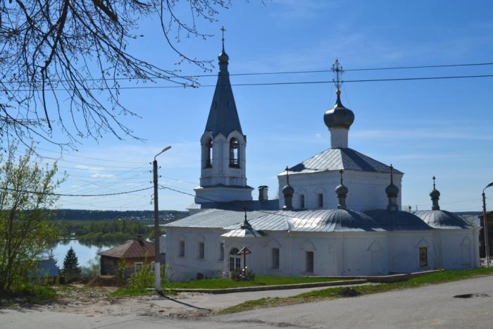 Благовещенская церковь с ажурным кованым крестом на куполе (построена в 1740 году, колокольня при ней — в 1868 году) расположена ниже к реке.
