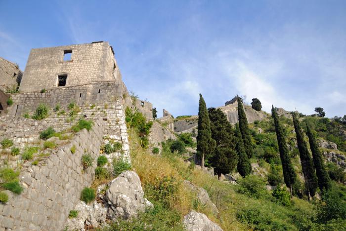 Меня тянет вверх к виднеющейся в горах крепости Святого Ивана. Девушки совсем не горят моим желанием, но уступают напору. При этом хочется проскользнуть мимо сборщиков дани. Путь наверх стоит три евро с человека. А между тем инет поделился сведениями о бесплатной интересной тропе. У меня получилось найти свой альтернативный путь. Миновав два официальных захода, я очередным мнимым тупичком вышел на гору. Тут даже какие-то небольшие огородики. Облаянный какими-то собаками я выбрался на простор и увидел тропку в траве, ведущую к стене. В стене проем и кажется, что за ним уже нормальный путь к крепости. Вернулся, нашел девчат и потащил их за собой. Вот только за проемом никакой хорошей дорожки не оказалось. Продолжается тропка. Раз она протоптана, значит приведет куда надо, но путь идет то по камушкам, то над обрывчиками, то в весьма колючей траве. Продравшись сквозь очередную острую заросль, я поглядел вниз на крайне недовольных спутниц, верх на далекие казематы и решил, что вместе нам точно не дойти. Не долезут они тут. И вниз к ним спускаться сквозь шипы очень не хотелось. В итоге разошлись. Они вниз, поджидать меня в каком-нибудь уютном местечке, я наверх в гору. Тропинка крайне обманчивая. Несколько раз мне казалось, что я уже выбираюсь на туристическую тропу, а она опять ныряла в колючие заросли. Были конечно и чудесные выходы к открытым пространствам с красивыми видами, но в основном это оказалось упрямым преодолением.