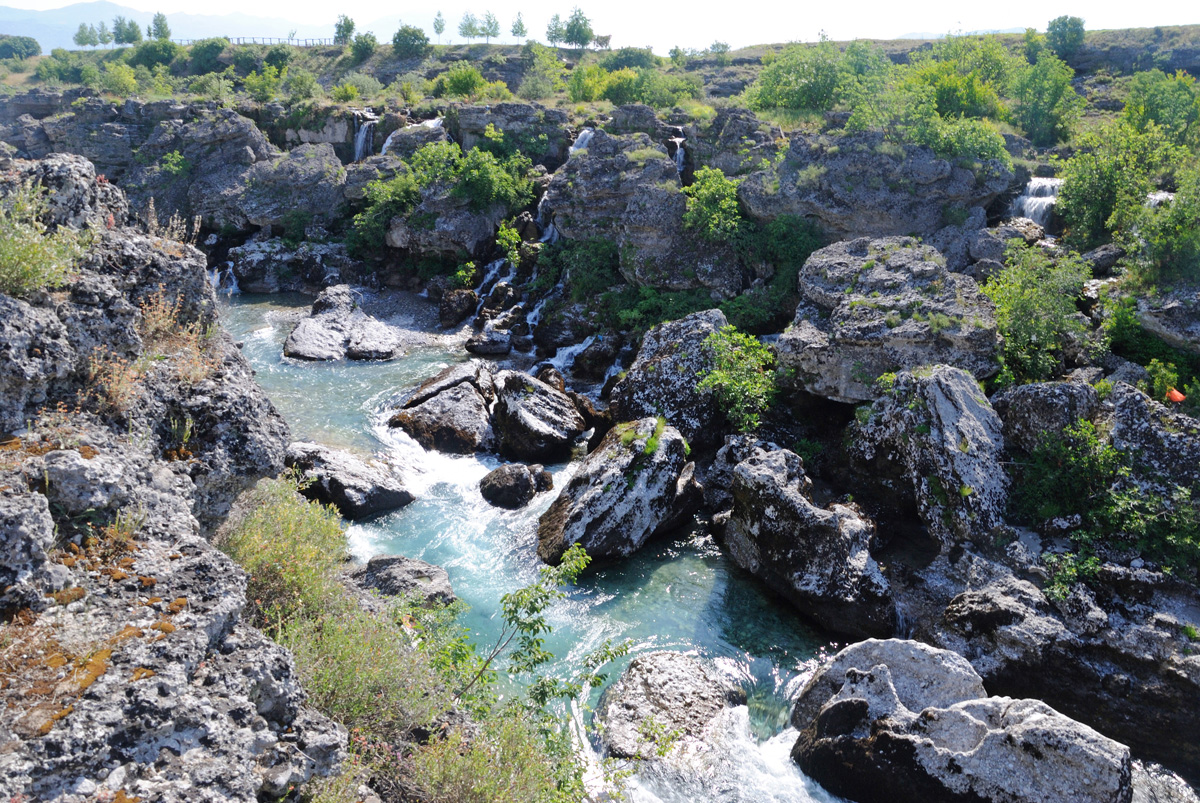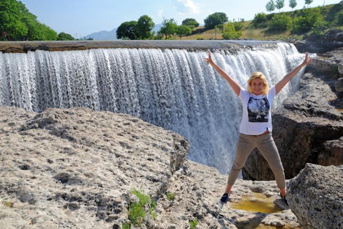 Свернули где надо, проехали какой-то завод и оказались среди ухоженных полей и виноградников, где, как оказалось, обитают зайцы. И вот уже мы на берегу Циевны, которая и устроила тут свою Ниагару. Сперва-то мы её не увидели. Когда мы со Светой (Таня всю дорогу любовалась снами и сейчас тоже не горела желанием просыпаться, хоть мегаваттное солнце уже вовсю светит) вышли из машины, то оказались на краю причудливо изрезанного скалистого каньона, с другой стороны которого по всем расщелинкам стекала вода.