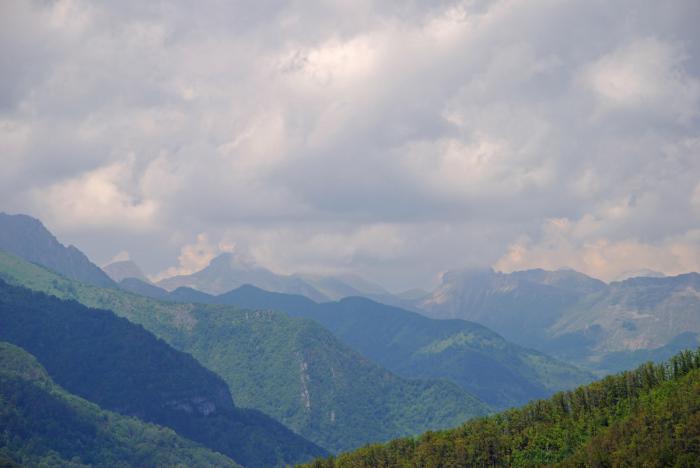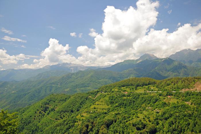Очень вовремя слегка притормозили, потому как чуть дальше за тоннелем, на обочине плавного виража местный гаишник общался с водителем недавно обогнавшей нас машины. Дальше была уже просто дорога. То среди деревьев, то с выездом на равнину, с неизменными спусками-подъемами и поворотами. И конечно же горы кругом.