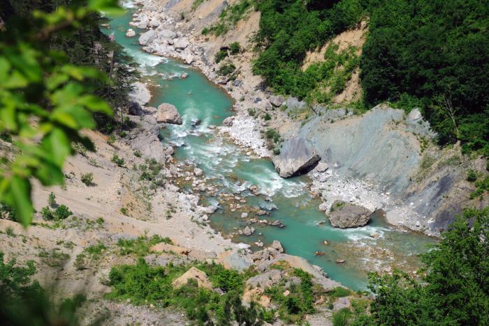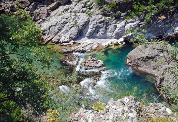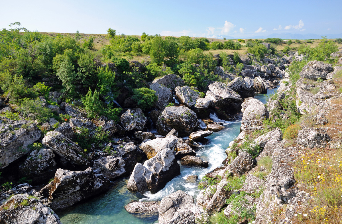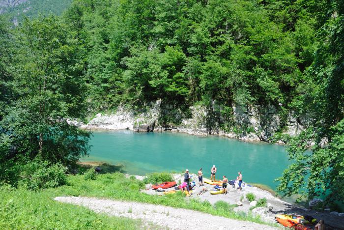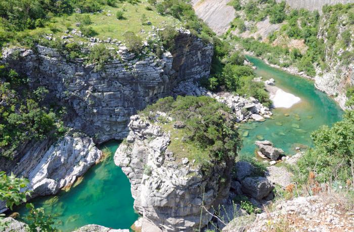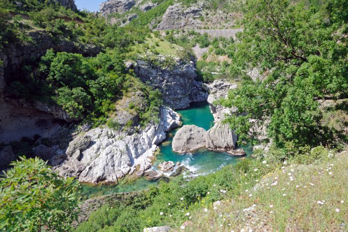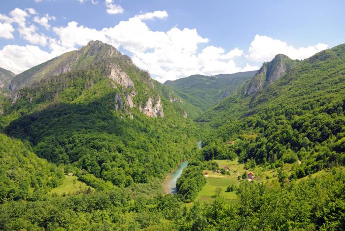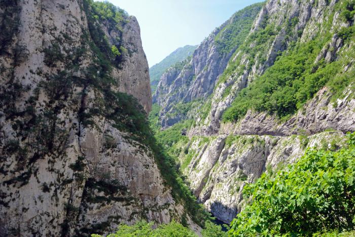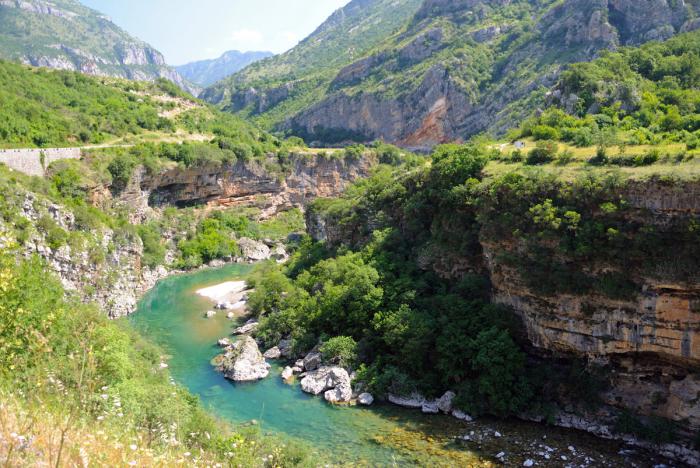 А там нас ждет Тара. Эта речка двести лет не меняет своего русла. Самый глубокий каньон в Европе, самая длинная река в Черногории и самое большое в Европе вместилище питьевой воды. Её можно пить без предварительной очистки. Дорога иногда спускается прямо к воде, где каякеры готовятся к сплаву, а порой взлетает высоко в горы, и бирюзовая полоска речки мелькает далеко внизу. И при этом перепаде высот каких-то сложных поворотов и страшных мест трасса в себе не таит. Если нет желания любоваться пейзажами, то ехать можно довольно быстро.