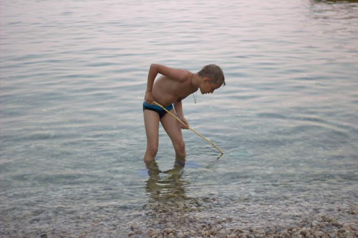 Велика Плажа. Сложно сказать, понравилось ли там больше, чем не понравилось. Ветра особого там не было, хотя поддувает. Песок не черный, а скорее с черными вкраплениями. Места – дофига и больше. Никто никому не мешает. Практически всегда можно найти лежак с зонтиком Без них – беда. Большой волнЫ не наблюдали, а длинные набегающие бугры использовали для катания и прыжков — вроде минисерфинга, очень весело :) Конечно там мелко – до самых буйков (метров 70) идешь едва по пояс. Но там можно спокойно плавать – и песчаной мути в волнистый день меньше, и глубина больше. Велика плажа — тоже рай для голопузиков :)