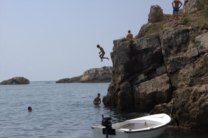 На пляже (пляжике) пришлых практически нету. Тут либо местные с детьми, либо совсем отъявленные ленивцы. Еще тут русских много, т.к. дальше вверх несколько вилл (отелей) принадлежащих нашим соотечественникам. Но опять же – весь народ сугубо из ленивцев, так что ни буйства, ни быдла опасаться не приходится. Половину пляжного отпуска мы провели тут. Не нравилось только жене – она любитель полежать на лежачке среди песочка. Но это лишь предпочтение – и здесь она была довольна ПОКОЕМ и отсутствием суеты. Там Глеб освоил CLIFF JUMPING