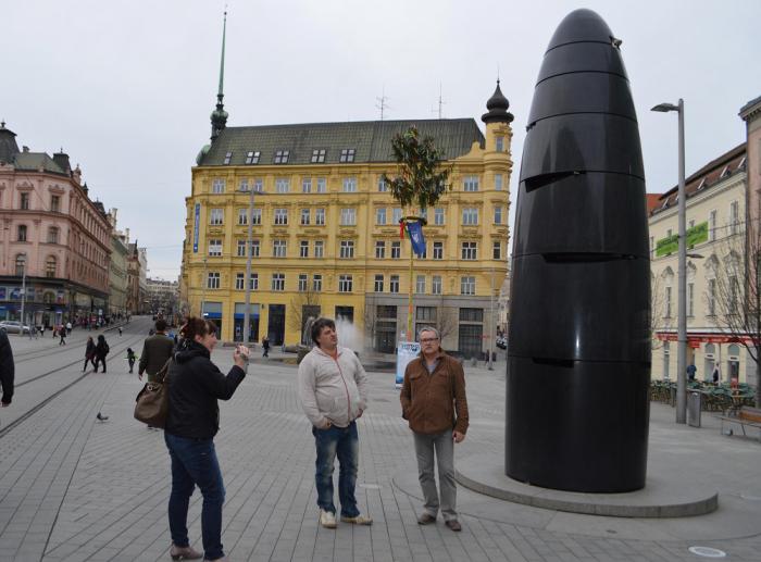 Еще более удивительна история колеса, которое расположено прямо рядом с крокодилом, под галереей старой Ратуши. Поспорив с друзьями за кружкой пива, колесных дел мастер умудрился за один день выбрать в лесу подходящее дерево, срубить его, сделать колесо и докатить его до Брно (примерно за 20 км) прежде, чем закроются городские ворота. Цена вопроса составила 12 монет, и пари было выиграно. Но успех вышел мастеру боком: добропорядочные горожане решили, что ему помогал сам дьявол, перестали давать ему заказы, в результате чего удалой ремесленник умер в нищете… Колесо же стало вторым символом Брно – но что именно оно символизирует?..
